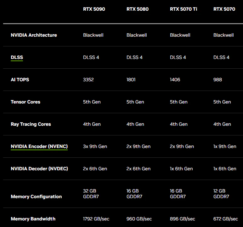La 5070 Ti si basa sull’architettura Blackwell ed è equipaggiata con il chip GB203, che offre 8960 CUDA core, 280 Tensor core, e 16GB di VRAM GDDR7 su bus a 256 bit.