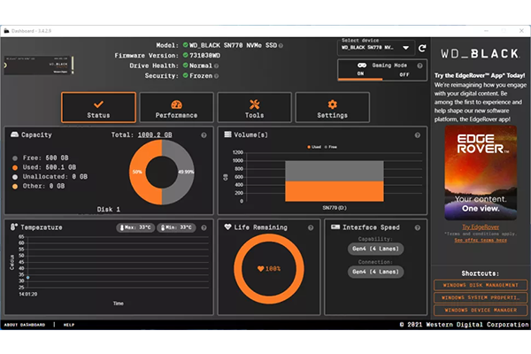 Maggiore controlloWD_BLACK Dashboard monitora lo stato dell’unità, regola le luci RGB e, solo sul modello SN850X, attiva la Modalità gioco 2.0 (Solo per Windows®). |