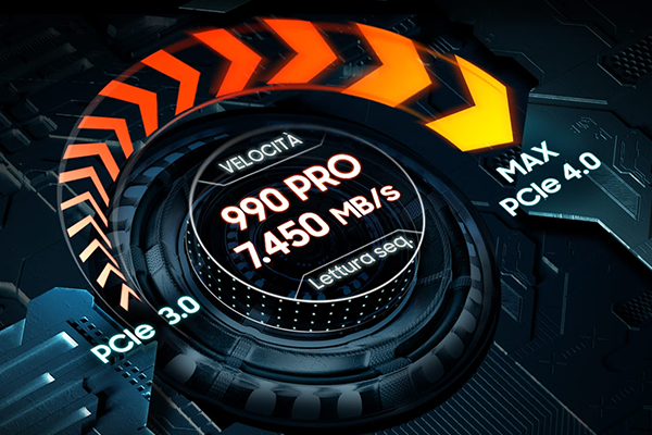 PCIe 4.0 al massimo della potenzaStraordinario aumento di velocità. 990 PRO offre velocità di lettura/scrittura sequenziali fino a 7450/6900 MB/s avvicinandosi alla massima performance di PCIe® 4.0. Fino al 40% e 55% più veloce in lettura/scrittura casuale rispetto a 980 PRO da 2TB – fino a 1400K/1550K IOPS. |