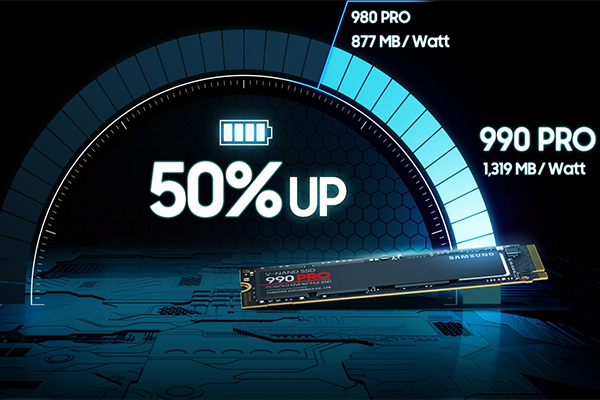Efficienza energetica all’avanguardiaPrestazioni più efficienti. Solitamente a performance più elevate corrisponde anche un maggiore consumo di energia. Ma 990 PRO riduce i consumi con un miglioramento della performance di oltre il 50% per Watt rispetto a 980 PRO, rendendo possibile raggiungere le massime performance di PCIe® 4.0 con un’efficienza energetica ottimale. |