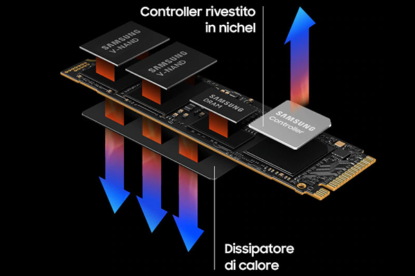 Soluzione termica intelligenteSupera il calore a tutta velocità. Il controller rivestito di nichel e un avanzato algoritmo di controllo termico gestiscono il calore, assicurando prestazioni costanti. Il dissipatore di calore regola la temperatura del chip NAND, mentre la tecnologia Dynamic Thermal Guard mantiene livelli di temperatura ottimali. |