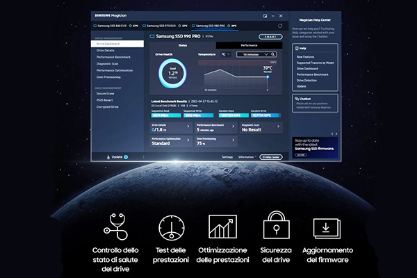 Software Samsung MagicianLibera tutta la potenza di 990 PRO. La suite di tool di ottimizzazione del software Samsung Magician rende perfetta la tua esperienza con gli SSD di Samsung. Proteggi i tuoi dati, ottieni aggiornamenti, monitora lo stato di salute del drive e imposta combinazioni di colore dei LED. Il tuo personale toolkit per gli SSD. |